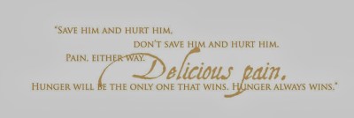 “Save him and hurt him, don’t save him and hurt him. Pain, either way. Delicious pain. Hunger will be the only one that wins. Hunger always wins.”